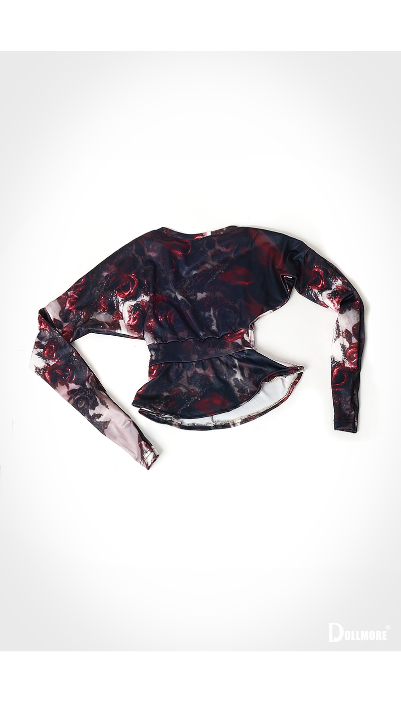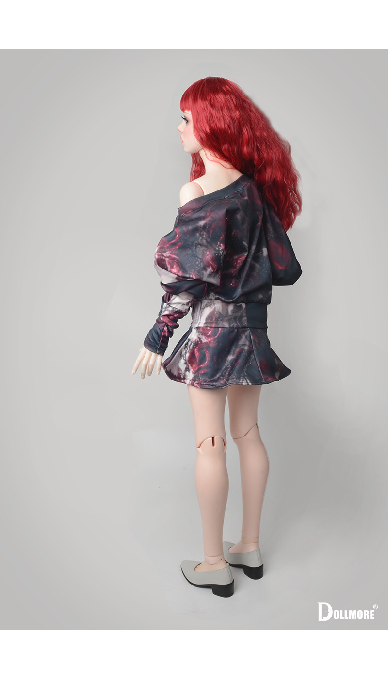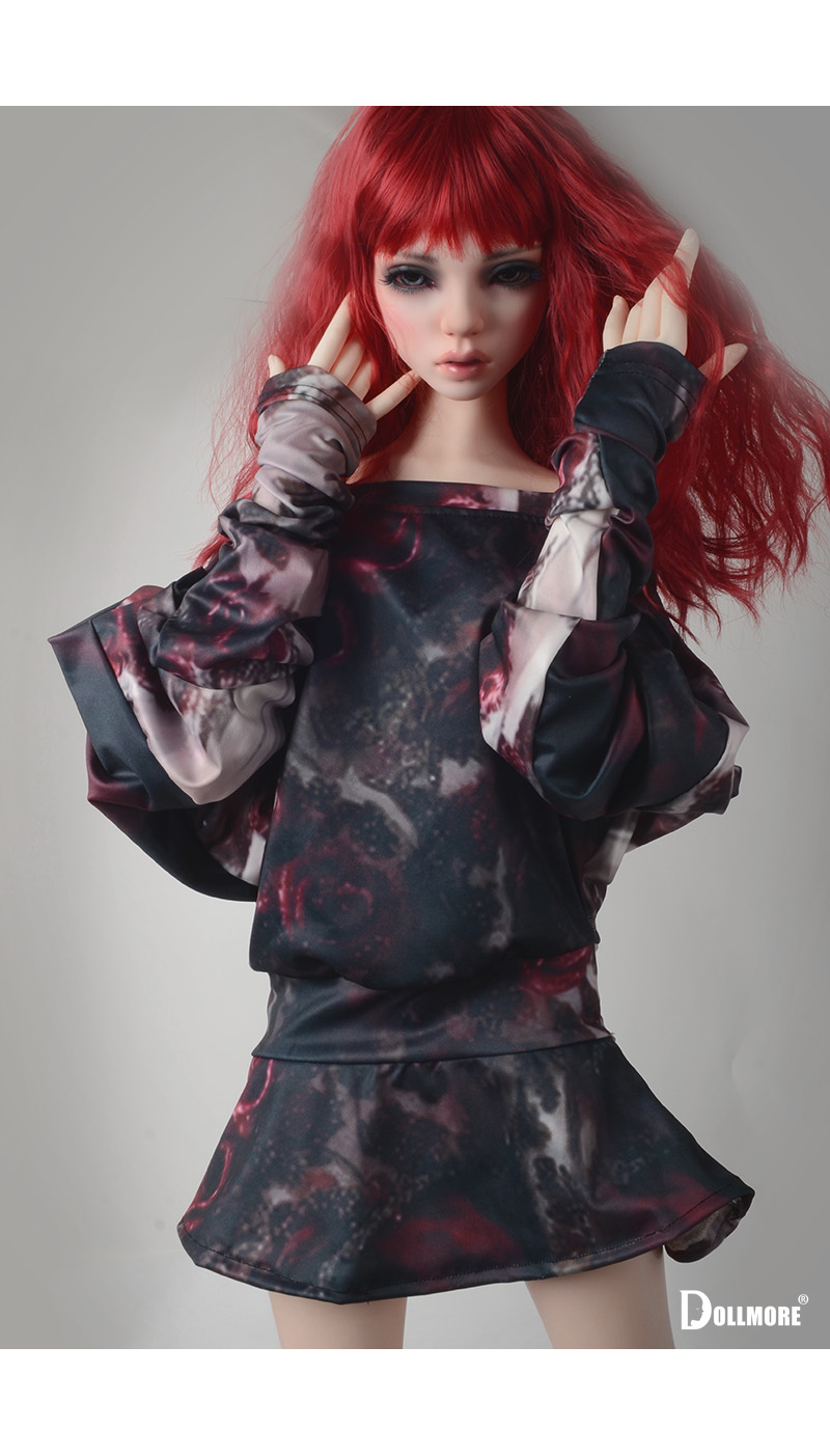 Crafted from a printed fabric blending deep crimson and dark tones, the dress conveys a dreamy and artistic mood.