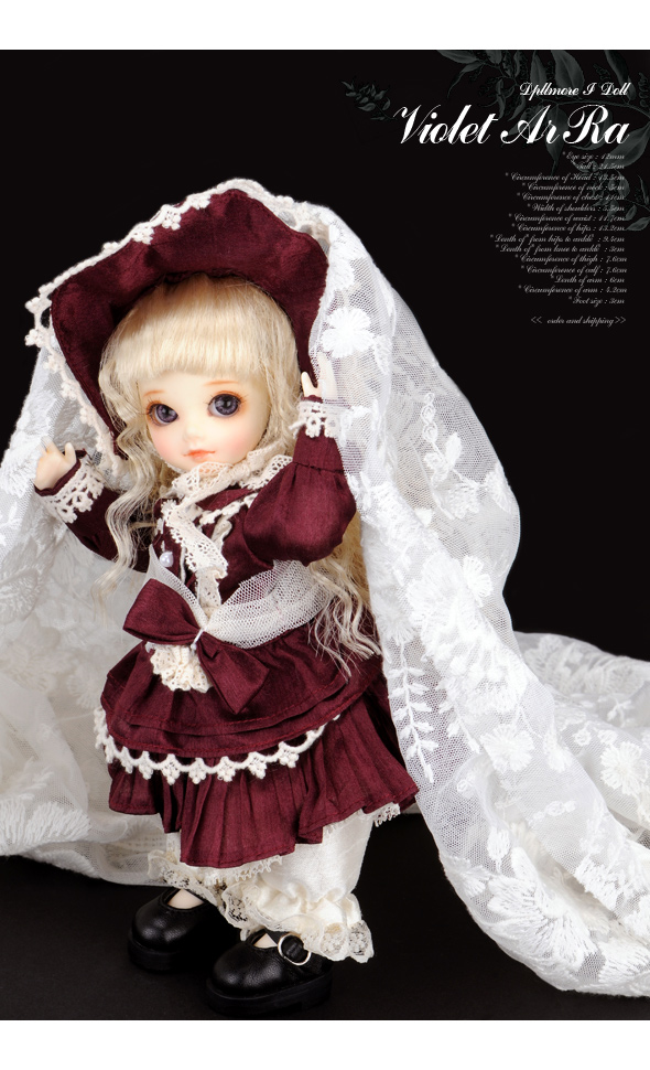 ================================================================== * (Limited Doll Dress) I Doll Size - I am a secret Violet Clothes Set - LE30 * Special Limited Edition- LE30 ========================================================= * I Doll - I am a secret (Violet Arra) - LE30 This is one of the limited edition clothes set for Dollmore I Dolls. It is a luxurious limited-edition clothes set. We made 30 set of this clothes set only. If you want to buy high quality clothes set for your doll, we recommend you buy this clothes set. If we sell out this clothes set, then we will stop to sell [I Doll - I am a secret (Violet Arra) - LE30] at the same time. Doll of the photo will not ship together. ================================================================== Clothes set Included: bonnet, jacket, dress, underpants * (한정의상)I Doll Size - I am a secret Violet Clothes Set - LE30 * Special Limited Edition- LE30 ========================================================= * I Doll - I am a secret (Violet Arra) - LE30 위 아이의 30벌한정으로 제작된 의상입니다. 한정인형이 모두 판매되면 의상판매도 종료됩니다. 개성적이면서 매력적인 고급스러운 한정의상입니다. 보다 정교하고 특별한 의상을 원하시는 분들께 추천드립니다. * 의상구성 : 보닛 + 상의자켓 + 드레스 + 속바지