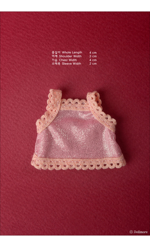 It is one of the basic sleeveless shirts designed for dollmore bebe dolls. This shirts is made of glitter fabric. It is also easy to coordinate with various dress. Very cute top for dollmore bebe dolls. * Included: 1 top * Model : Dollmore Bebe Doll Biya ( Tall : 14.5 cm == 5.7 inch) 은은하게 반짝이는 나시에 레이스장식이 살짝 들어간 기본형 민소매 상의입니다. 어느옷에나 잘 어울리는 기본 아이템입니다.^^ 귀엽고 이쁘고 좋아용~ * 구성 : 상의 * 모델 : 돌모아베베돌 비야 (키 : 14.5cm)