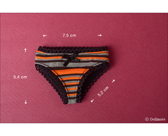It is a basic panty designed for 1/4 scale bjd doll including dollmore kids doll. This panty is made of cotton with high elasticity. It fits well to dollmore kids doll. We suggest you wear panty inside before wearing long dress or pants to your doll. * Included: 1 panty * Model: Dollmore Kids Doll Heizle ( Tall : 43.5 cm == 17inch, head circumference: 7-8 inch) 스판원단으로 만들어진 섹시한 삼각팬티입니다. 캐주얼하고 복고적인 컬러감이 재밌네요.^^ 입체감있는 패턴으로 더욱 밀착감을 높였습니다.^^ 몸에 딱붙는 스타일로 착용감이 좋습니다.^^ 이젠 바지속에 꼭 속옷도 챙겨서 입혀주세요.^^ * 모델 : 돌모아키즈 헤이즐 (헤드둘레 : 7-8 /키 : 43.5cm)