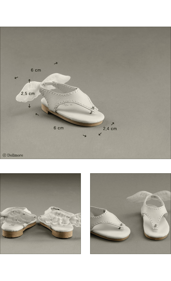* Notice: There is little crack inside of this boots. So we sell it with 40% off price. It is impossible to refund or exchange damage sale item. There are cool slingback sandals with a wide vamp strap. It fits well on 'Dollmore Kid Feet Set - Feet Set For Flip Flops & Geta' only. It's not suitable for any basic foot without a gap between the first and second toe. Let’s have a cool summer~! * Included: 1 pair of shoes * Size : 6cm X 2.4cm X 2.5cm * Model : Dollmore Kid - Grammy (Tall : 43 cm -- 17 inch) * 데미지세일로 할인 하는 제품으로 일부 표면에 문제가 발생하였습니다. 세일상품은 교환및 환불이 되지 않으니 신중한 구매 부탁드립니다. 날개가 달린 사랑스럽고 귀여운 조리스타일 샌들입니다~ 'Dollmore Kid Feet Set - Feet Set For Flip Flops & Geda (Normal)'에게 잘맞는 신발로 엄지와 검지가 붙은 발파츠에는 맞지 않아요~ 귀엽고 시원스런 여름을 즐겨보아요~ * 구성 : 조리샌들 한켤레 * Size : 6cm X 2.4cm X 2.5cm * 모델 : 돌모아키즈 글래미 (키: 43cm)