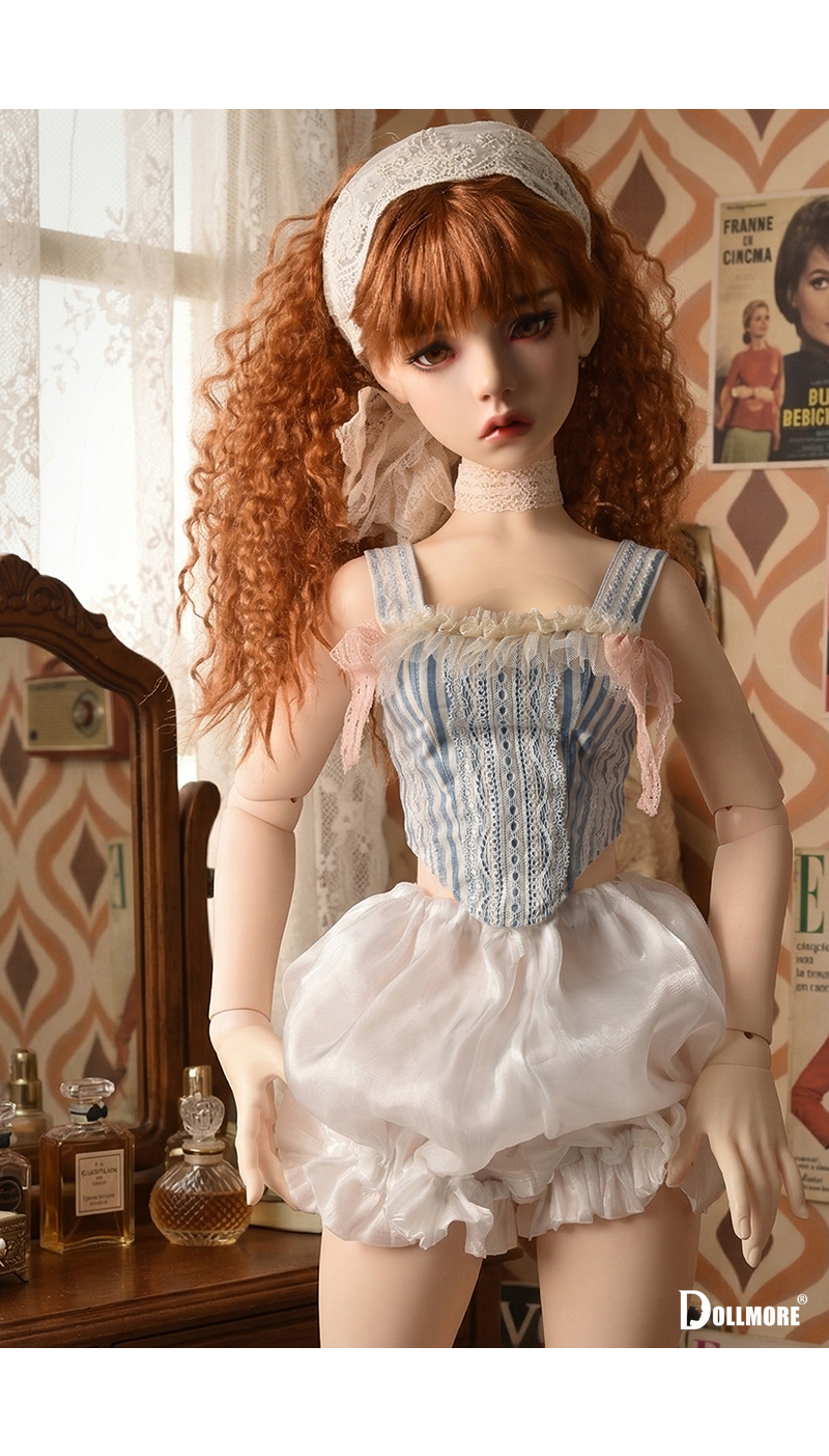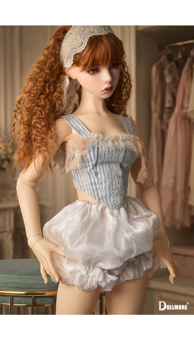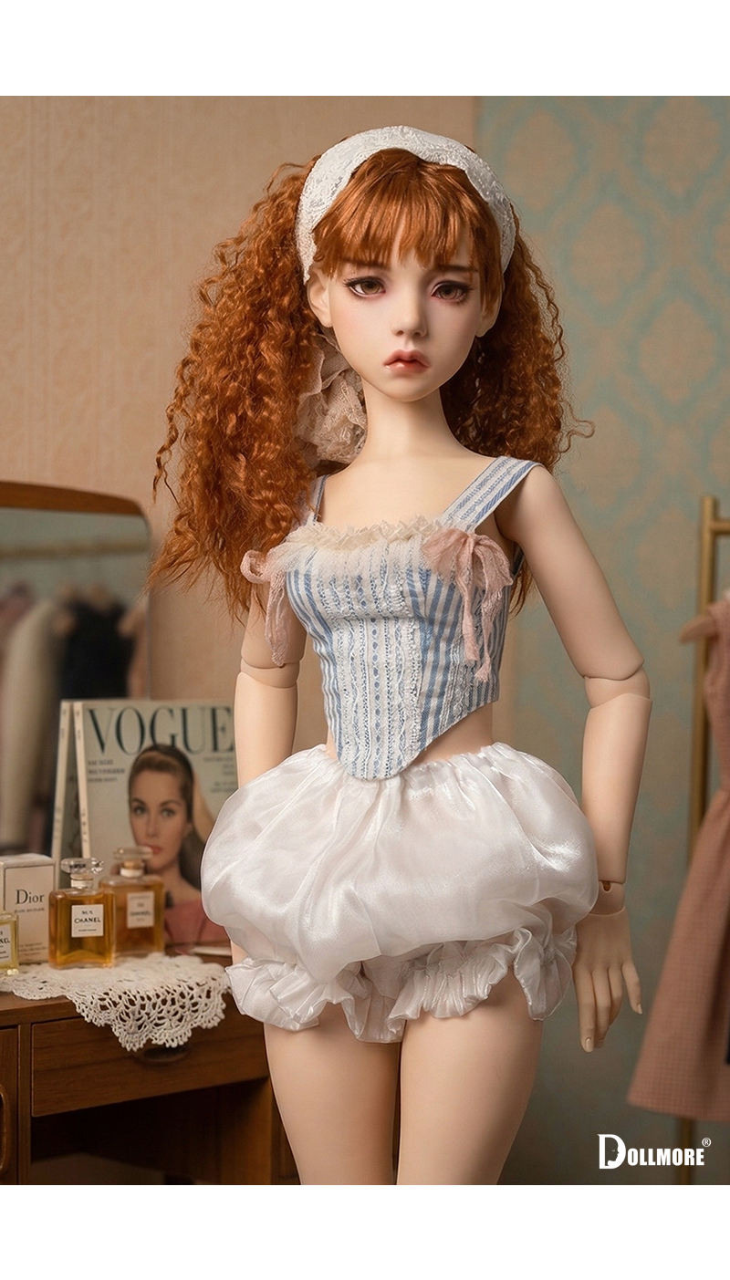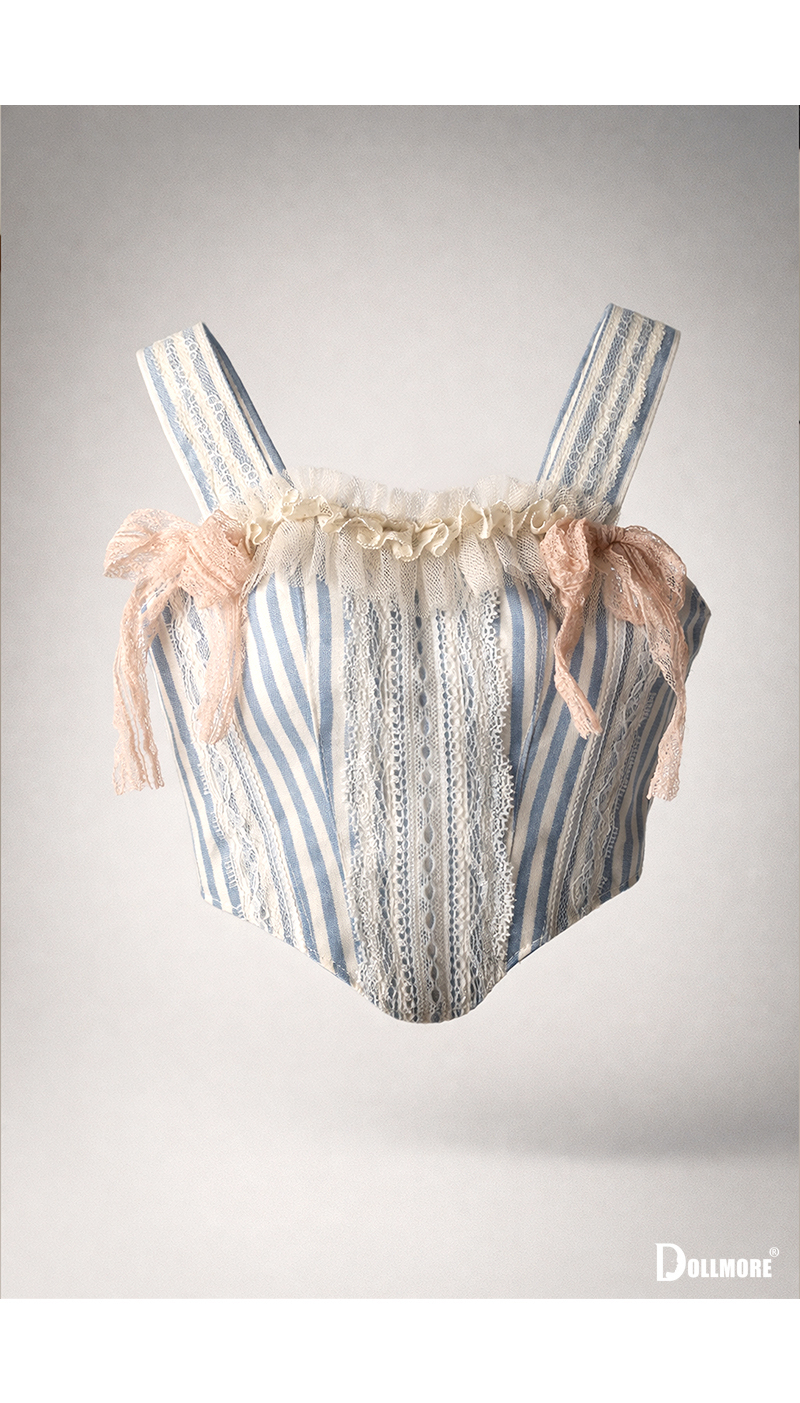 This is a beautiful corset-style top made of cotton fabric. Delicate lace details layered over the soft blue stripe pattern create a romantic yet classic mood. The slim corset-style silhouette that follows the body line adds an elegant and feminine touch, while the lace decoration on the front enhances the overall look with a refined and delicate finish. Designed with shoulder straps for a secure fit, this top is further accented with a frilled neckline and soft ribbon details on both sides, adding a lovely and girlish charm. It is beautiful even when worn on its own, and can be styled with a variety of skirts or pettipants to create a fuller and more romantic look. The soft texture of natural cotton fabric combined with the delicate lace trim makes this corset top a graceful and charming piece. * Included: Top 1 * Model Doll : Trinity Doll F - Small Orgel; Eugenia - LE10 (Height : 105 cm / approx. 41.3 inches)