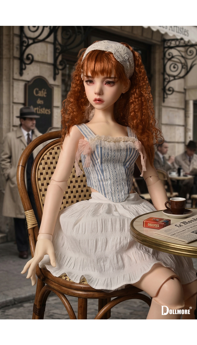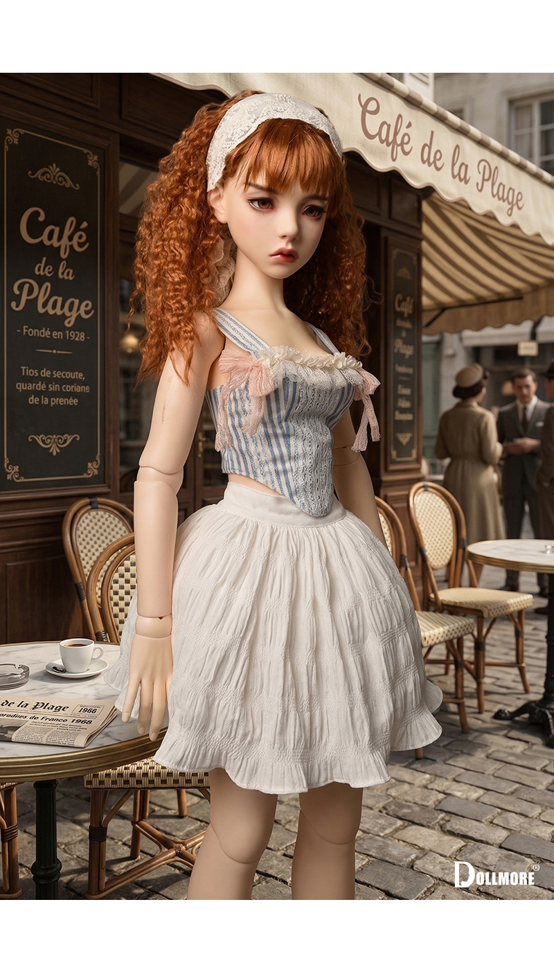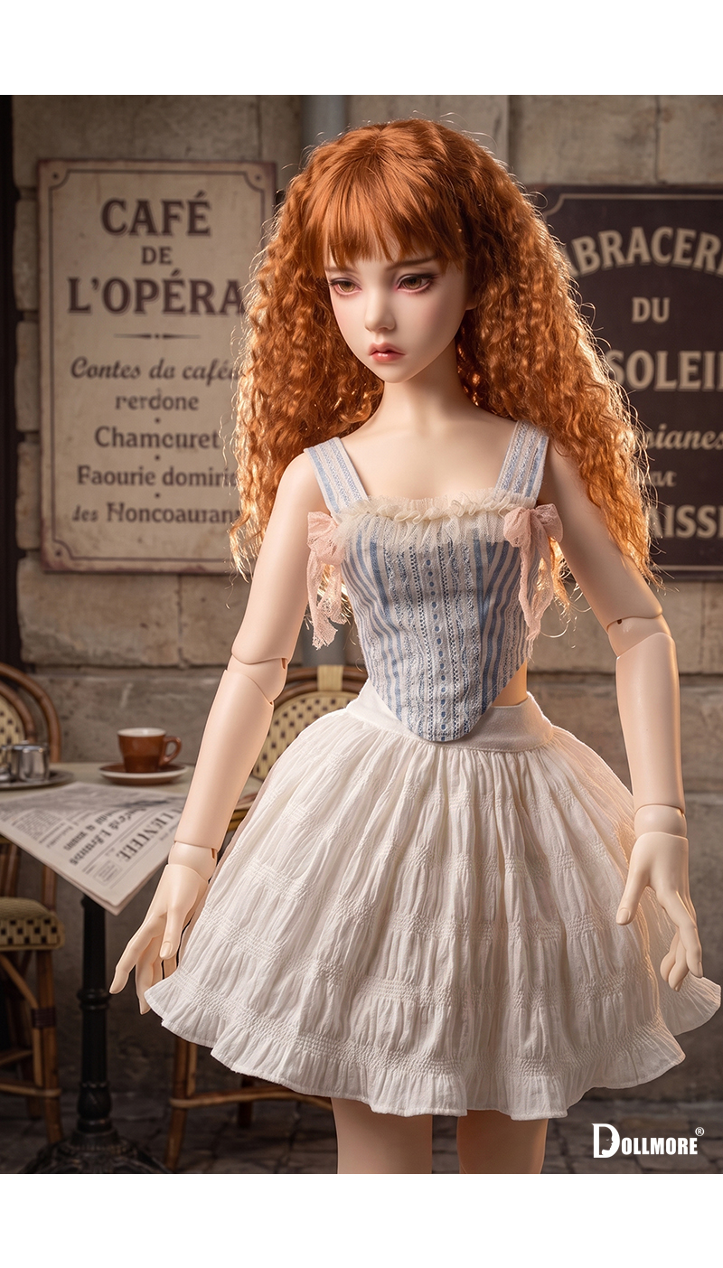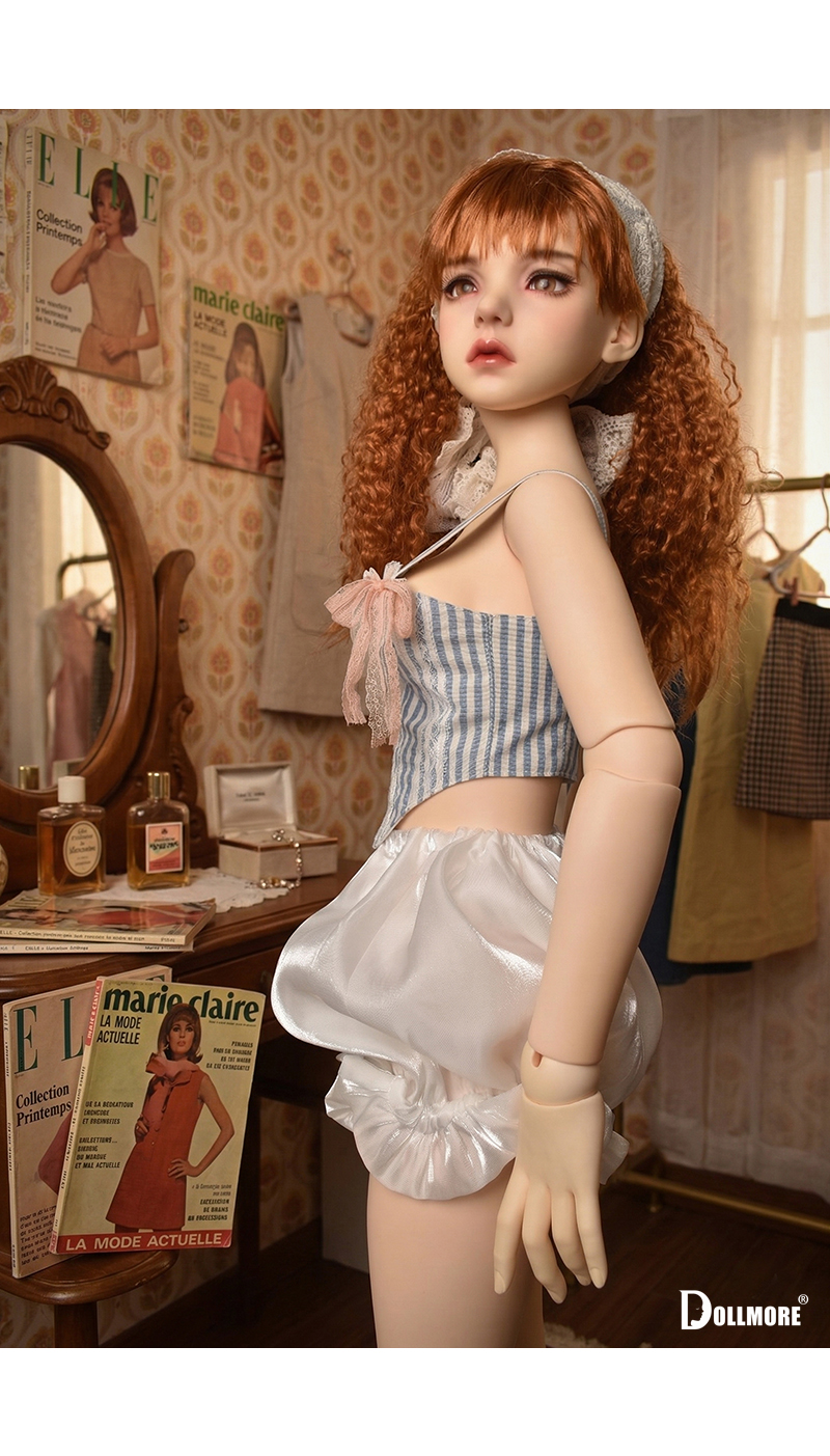This is a beautiful corset-style top made of cotton fabric. Delicate lace details layered over the soft blue stripe pattern create a romantic yet classic mood. The slim corset-style silhouette that follows the body line adds an elegant and feminine touch, while the lace decoration on the front enhances the overall look with a refined and delicate finish. Designed with shoulder straps for a secure fit, this top is further accented with a frilled neckline and soft ribbon details on both sides, adding a lovely and girlish charm. It is beautiful even when worn on its own, and can be styled with a variety of skirts or pettipants to create a fuller and more romantic look. The soft texture of natural cotton fabric combined with the delicate lace trim makes this corset top a graceful and charming piece. * Included: Top 1 * Model Doll : Trinity Doll F - Small Orgel; Eugenia - LE10 (Height : 105 cm / approx. 41.3 inches)