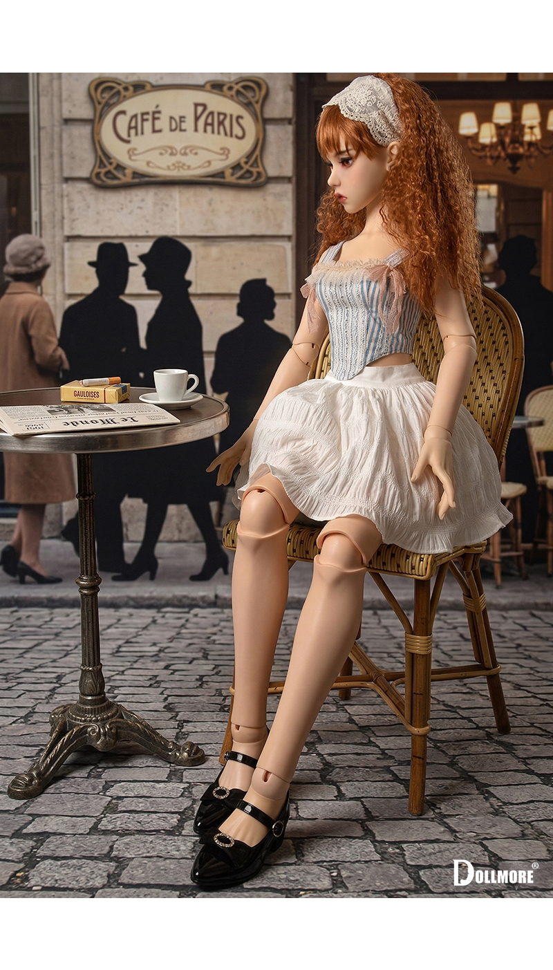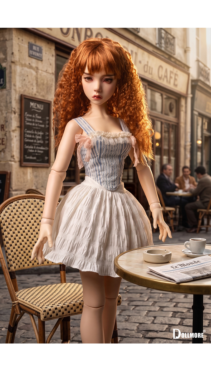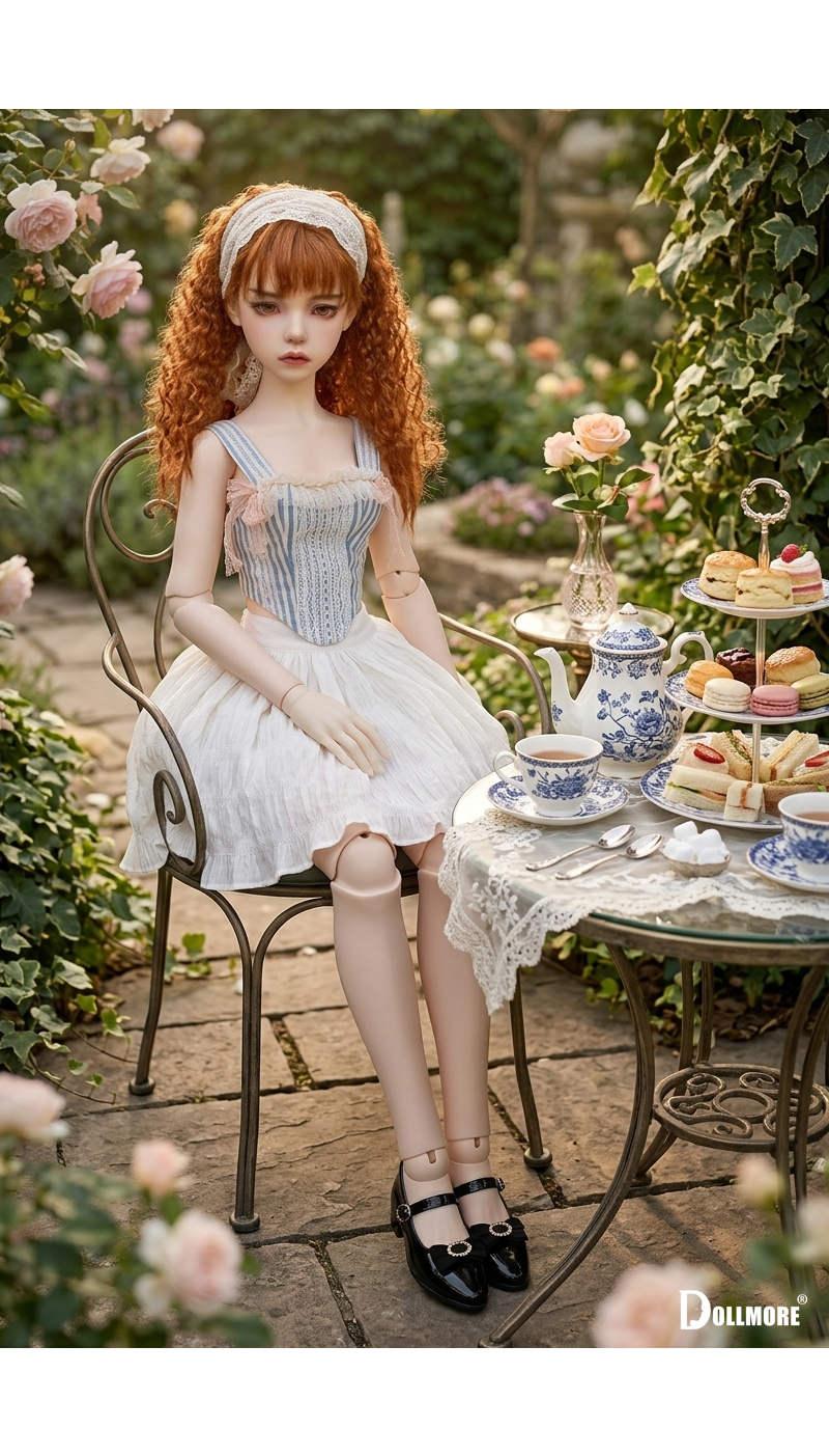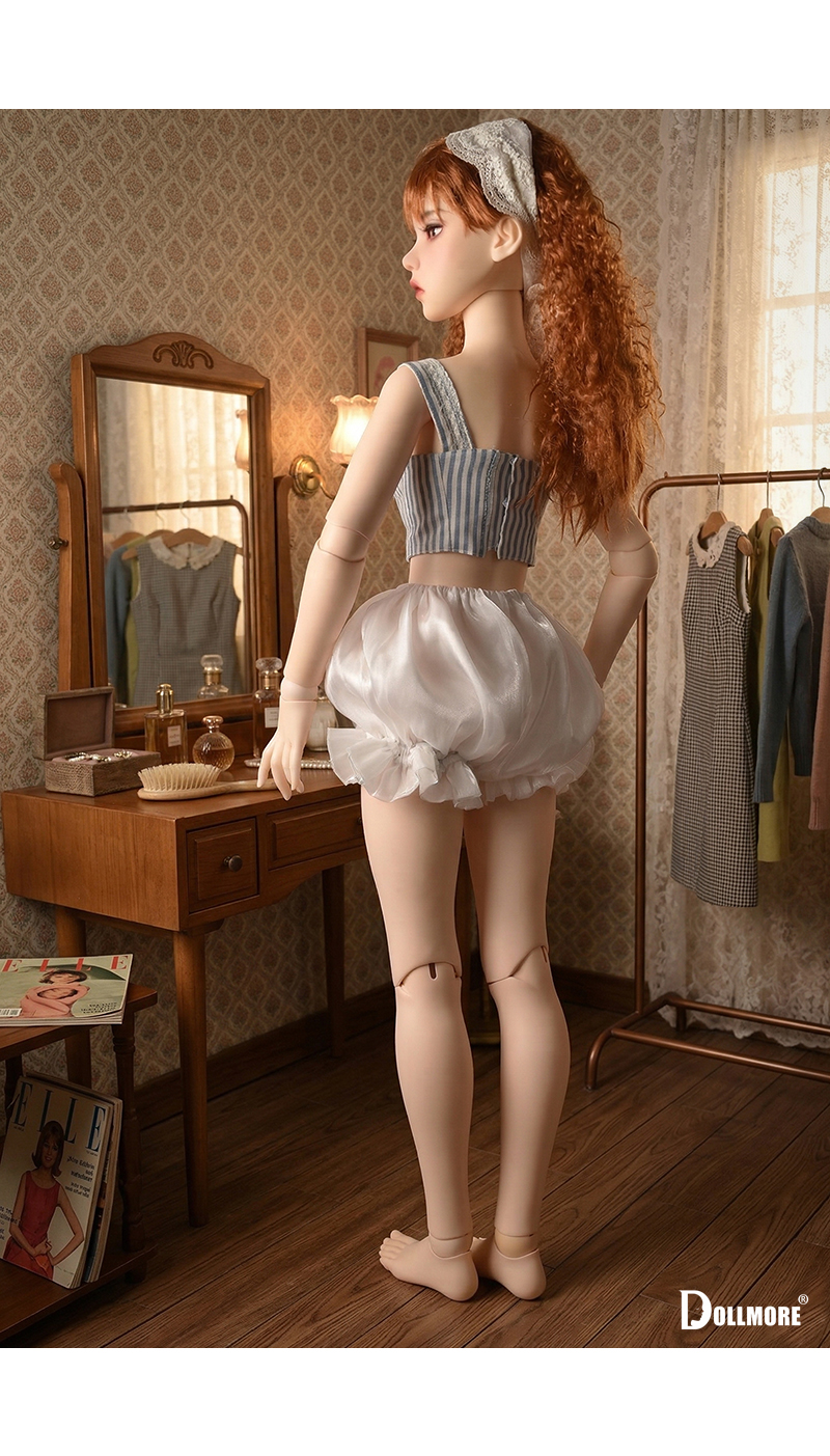 This is a beautiful corset-style top made of cotton fabric. Delicate lace details layered over the soft blue stripe pattern create a romantic yet classic mood. The slim corset-style silhouette that follows the body line adds an elegant and feminine touch, while the lace decoration on the front enhances the overall look with a refined and delicate finish. Designed with shoulder straps for a secure fit, this top is further accented with a frilled neckline and soft ribbon details on both sides, adding a lovely and girlish charm. It is beautiful even when worn on its own, and can be styled with a variety of skirts or pettipants to create a fuller and more romantic look. The soft texture of natural cotton fabric combined with the delicate lace trim makes this corset top a graceful and charming piece. * Included: Top 1 * Model Doll : Trinity Doll F - Small Orgel; Eugenia - LE10 (Height : 105 cm / approx. 41.3 inches)